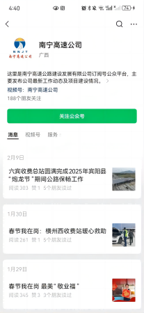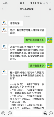 司乘只需關(guān)注“南寧高速公司”微信公眾號(hào),點(diǎn)擊發(fā)消息即可輕松開(kāi)啟在線(xiàn)咨詢(xún)之旅。這種將AI智能客服融入微信公眾號(hào)的方式,充分考慮了司乘人員的使用習(xí)慣,進(jìn)一步拉近了企業(yè)與司乘之間的距離。